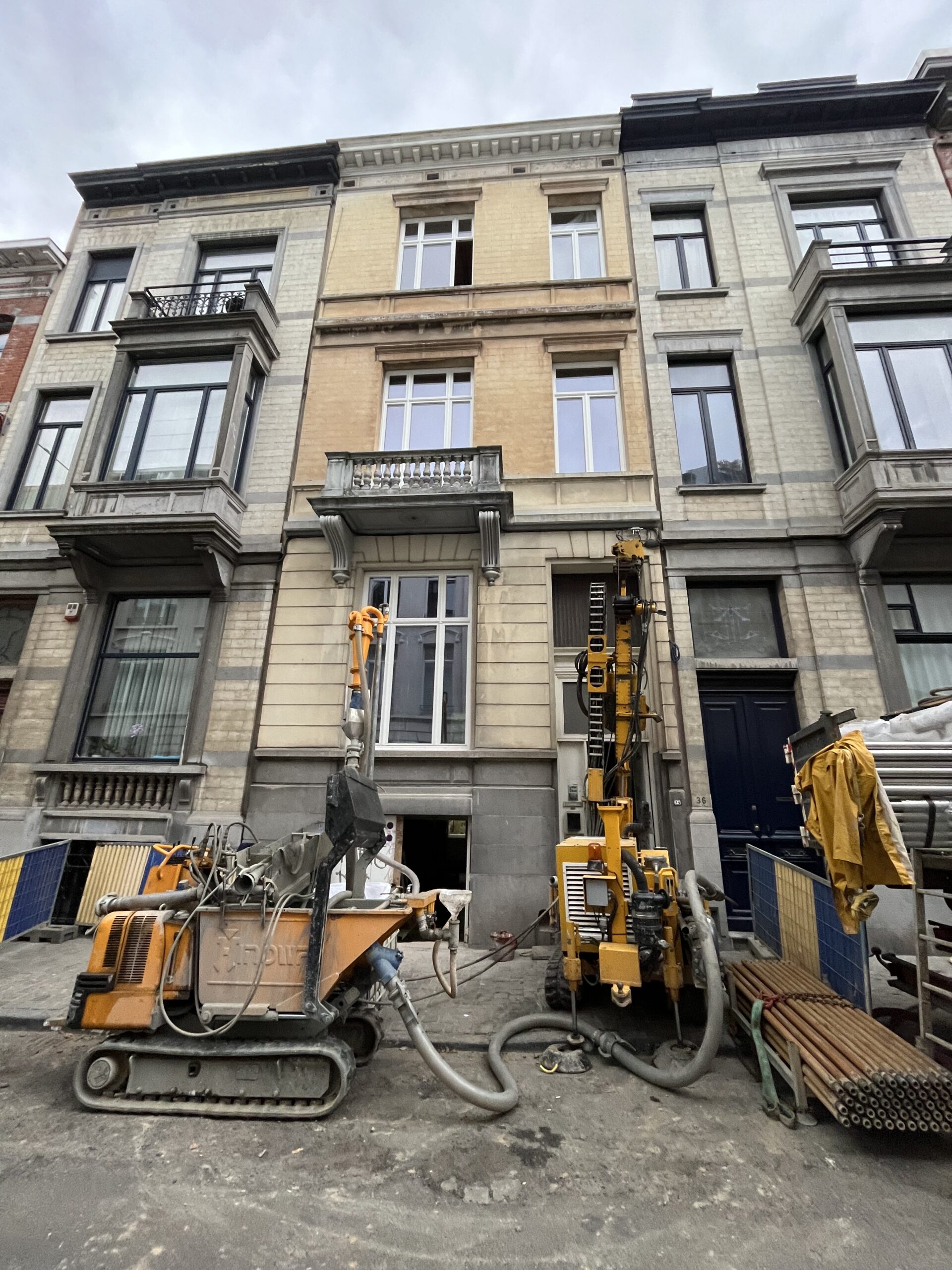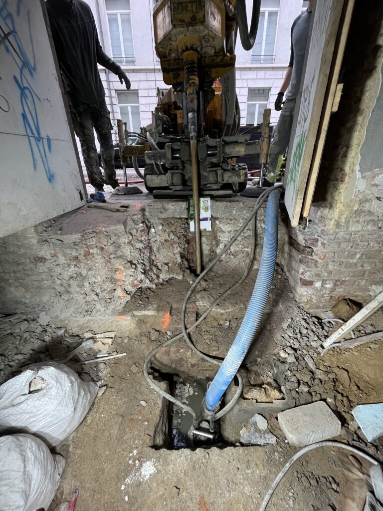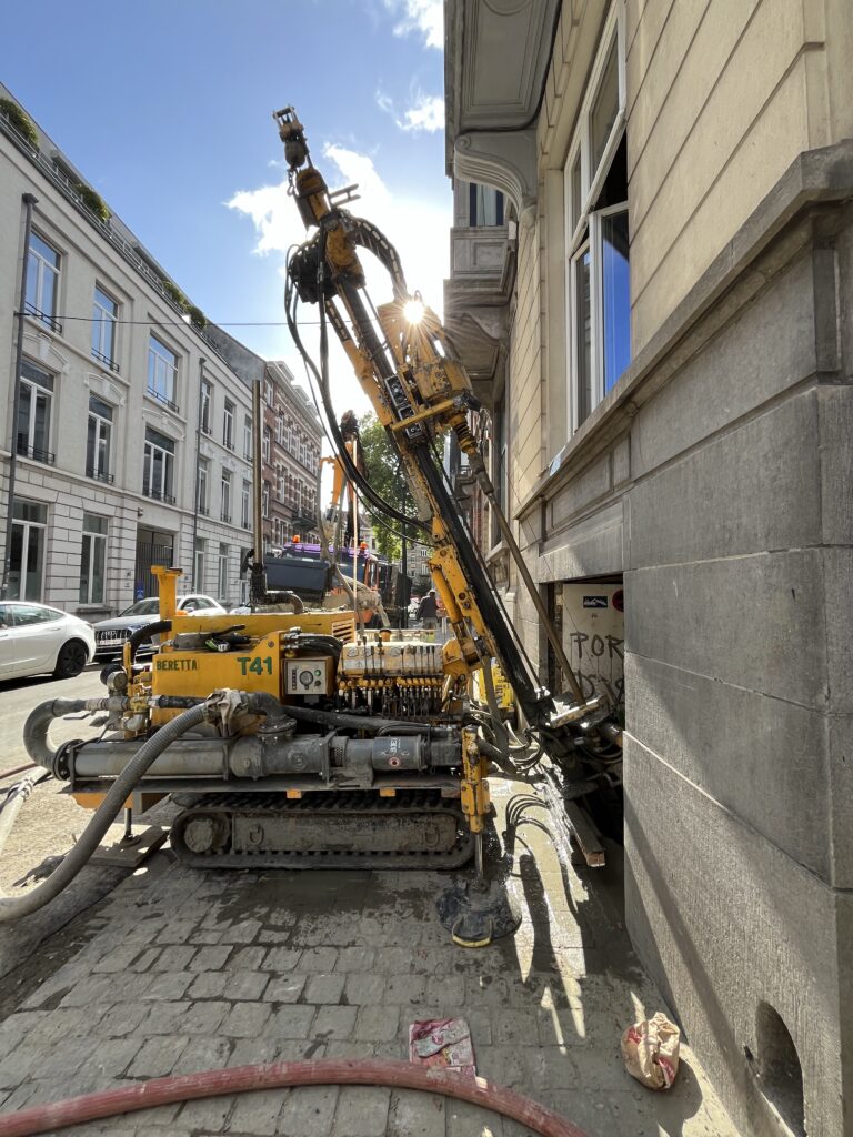 Un accès par grutage au-dessus de la maison était techniquement possible, mais ne représentait pas la solution la plus économique. Grâce au mât inclinable de la foreuse, les forages ont pu être réalisés depuis le trottoir, en passant au travers d’un soupirail et d’une fenêtre espacés de 3 mètres